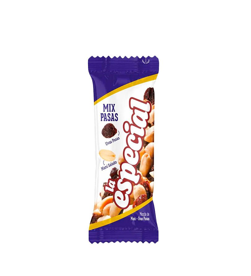La perfecta mezcla de maní con sal, maíz tostado, maní confitado y pasas.
