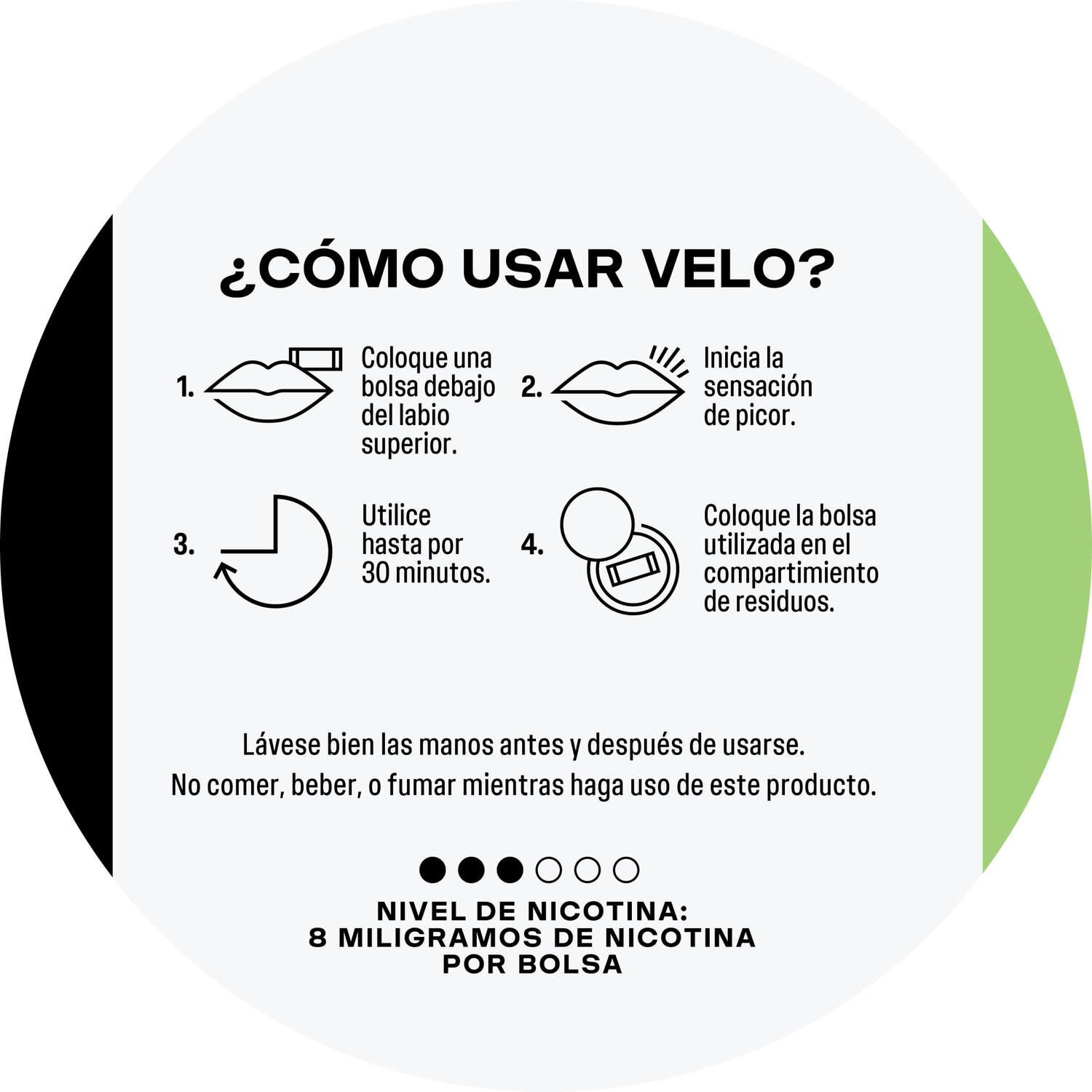 VELO es una bolsa de nicotina sin-tabaco, que ofrece a los adultos que consumen-tabaco y/o nicotina una alternativa innovadora, cómoda y conveniente de consumir nicotina sin utilizar sus manos.